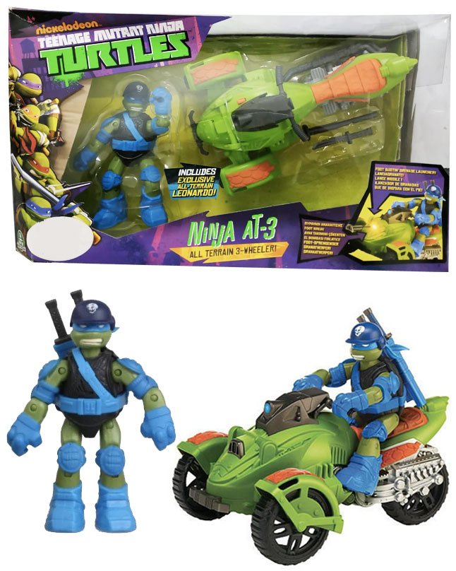 The Ninja AT-3 All Terrain 3-Wheeler is an all new sculpted vehicle and features a front missile launcher, and can seat two figures. The vehicle has a ton of details sculpted on the body and on the rear engine. The Ninja AT-3 has three ties, two front and one rear, and has two seats of foot rests on the sides for both figures.